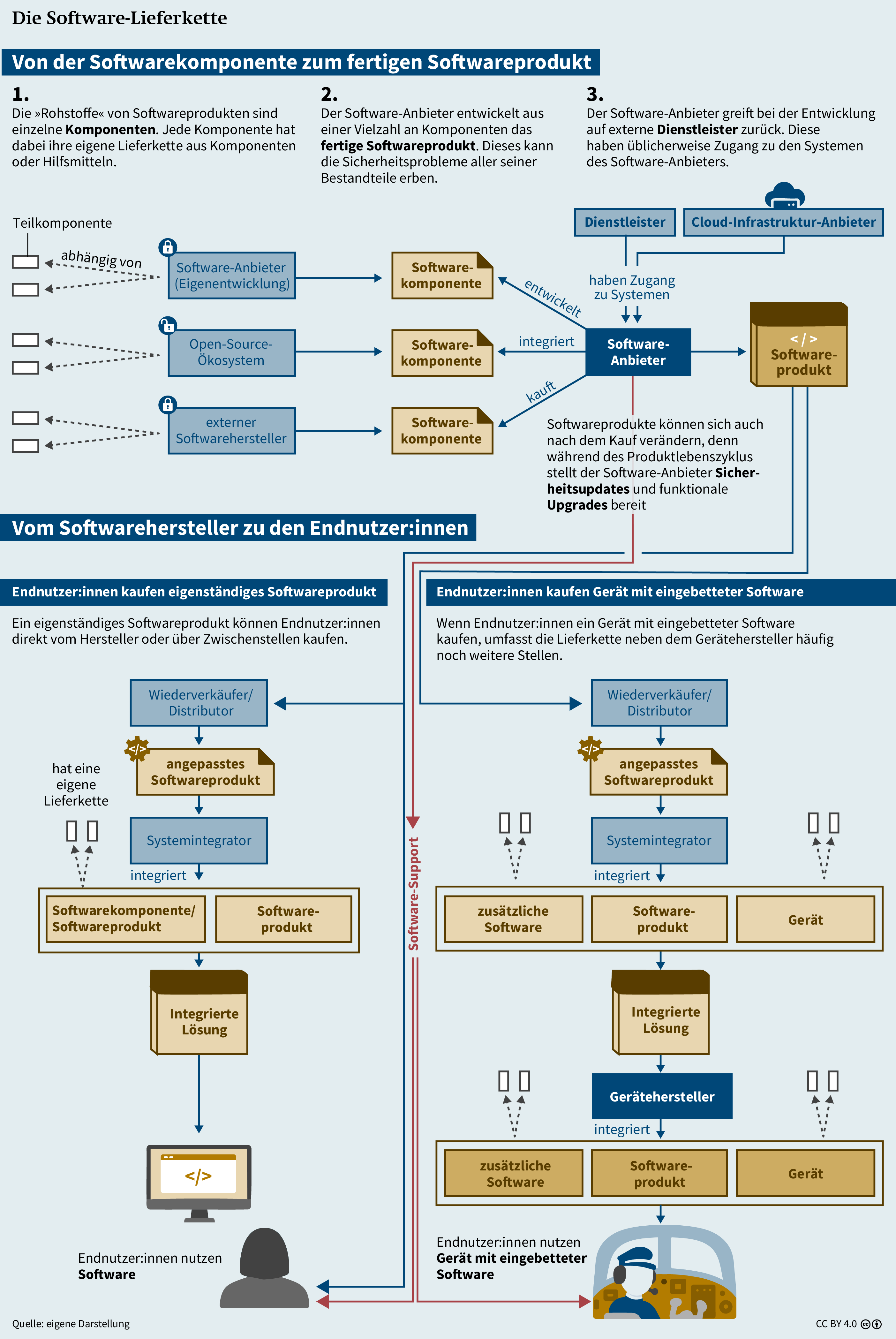Jede Softwarekomponente hat ihre eigene Lieferkette, da sie sich wiederum auf Bausteine oder zumindest auf Hilfsmittel wie etwa Compiler stützt, die für Menschen lesbaren Quellcode in maschinenlesbaren Binärcode übersetzen. Da Softwareprodukte die Sicherheitsprobleme aller ihrer Bestandteile erben können, ist es zur Bewertung der (Un-)Sicherheit eines bestimmten Softwareprodukts erforderlich, all seine Komponenten und deren Teilkomponenten zu betrachten.