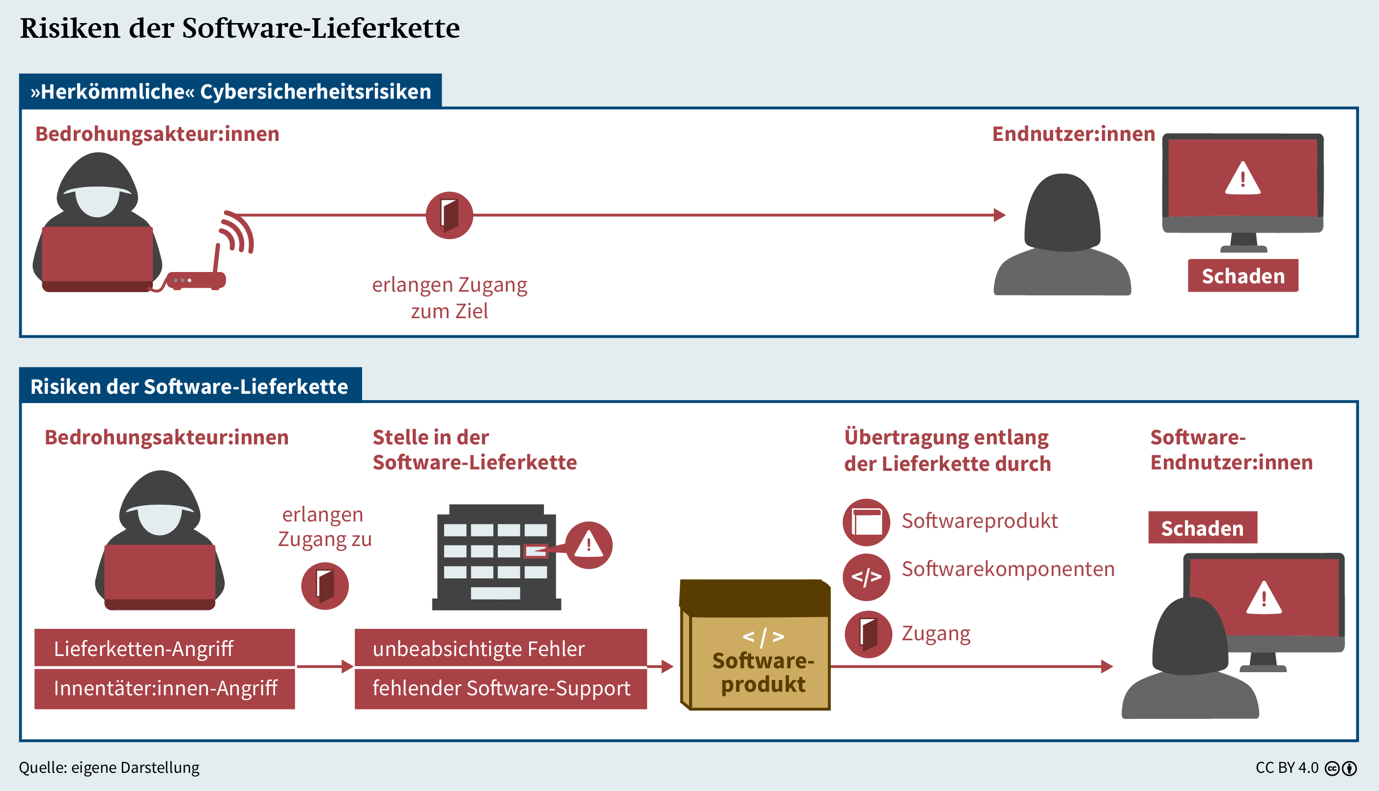 Bei »herkömmlichen« Cybersicherheitsvorfällen verschaffen sich Bedrohungsakteur:innen häufig direkt Zugang zu ihrem Ziel. Im Gegensatz dazu haben Risiken der Software-Lieferkette ihren Ursprung an einer vorgelagerten Stelle der Lieferkette und treten dann an anderer Stelle in Form eines schädlichen Effekts zutage – häufig bei den Endnutzer:innen. Zum Beispiel drangen russische Spione zwischen 2019 und 2020 nicht direkt in die IT-Systeme der US‑Behörde ein, die das US-Atomwaffenarsenal wartet. Stattdessen verschafften sie sich Zugang zum Softwarehersteller SolarWinds, um von dort aus ein Update mit Schadsoftware an die gut gesicherte Behörde zu senden und so an ihrem Ziel Daten abzugreifen.