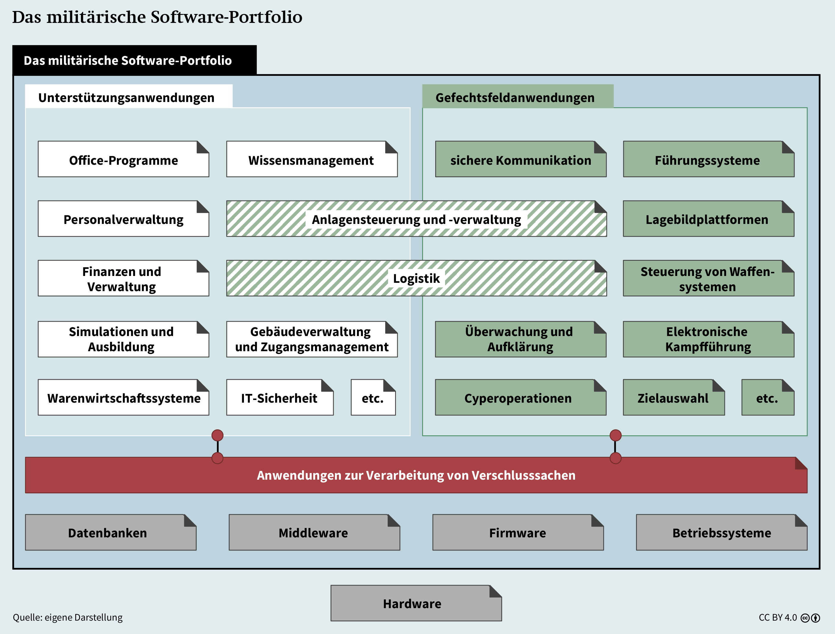 Streitkräfte nutzen ein breites Portfolio verschiedener Softwareprodukte (siehe Grafik 3). Dabei verwenden sie einerseits, wie zivile Organisationen, Software zur Prozessunterstützung und zur Verarbeitung von Informationen. Zu diesen unterstützenden Anwendungen gehören beispielsweise Office-Programme oder Warenwirtschaftssysteme. Andererseits brauchen Streitkräfte Gefechtsfeldanwendungen wie Lagebildplattformen oder Führungssysteme. Darüber hinaus arbeiten Streitkräfte mit Verschlusssachen und die Systeme, die solche Daten verarbeiten, müssen besondere Sicherheitsanforderungen erfüllen. Schließlich sind all diese Anwendungen auf eine ganze Reihe anderer Softwaretypen angewiesen, wie etwa Betriebssysteme und Datenbanken.