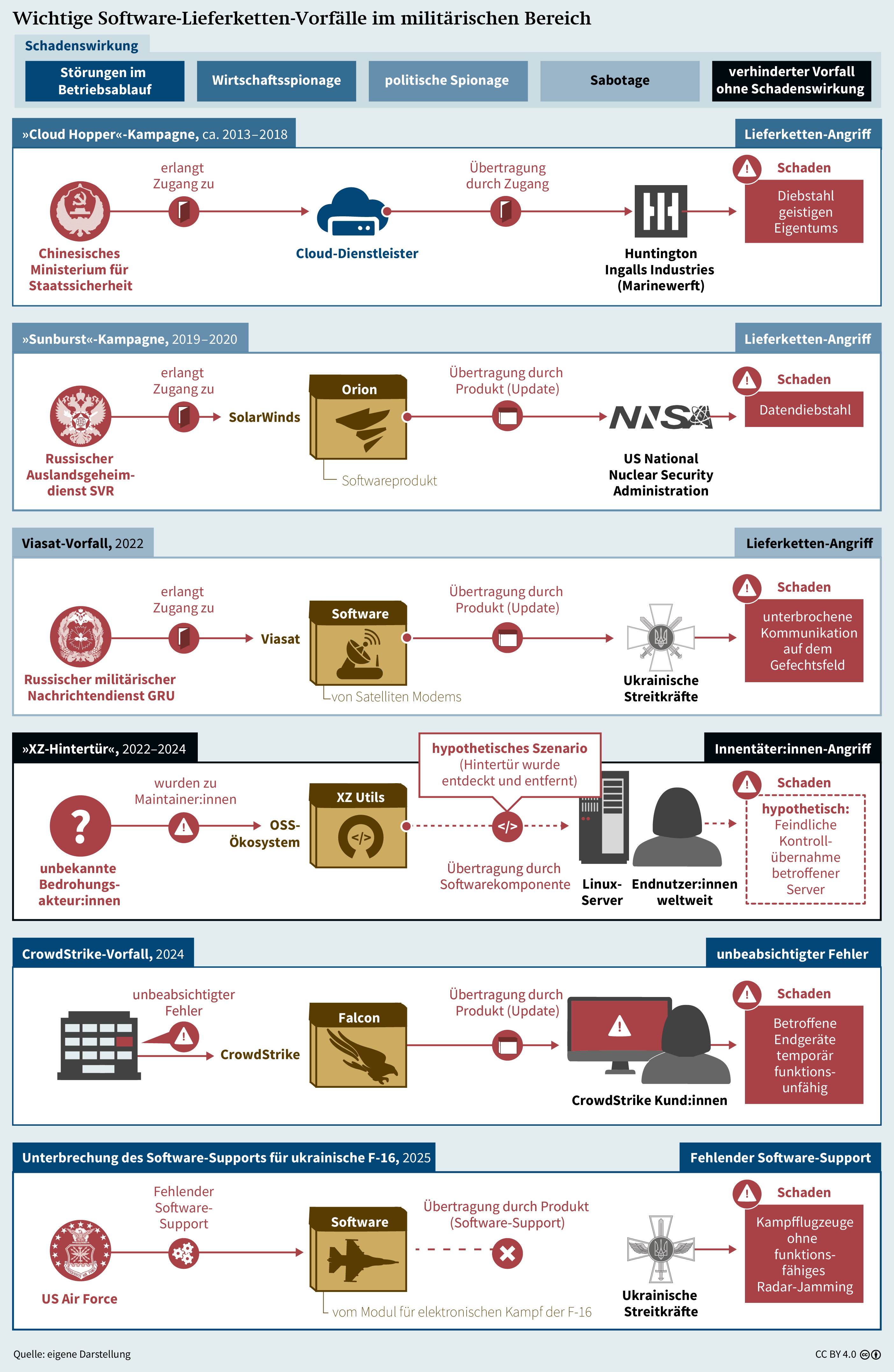 Vorfälle, in denen die Software-Lieferkette eine Rolle spielt, können militärische Betriebsabläufe unterbrechen oder es böswilligen Akteur:innen erlauben, Wirtschaftsspionage, politische Spionage und Sabotage zu betreiben. So erlangten etwa zwischen 2013 und 2018 Personen aus dem Umfeld des chinesischen Nachrichtendienstes über Cloud-Anbieter Zugriff zu den Systemen der größten US-Marinewerft. Und 2022, am ersten Tag der russischen Invasion der Ukraine, kaperte der russische Militärgeheimdienst ein Software-Update eines Satellitenkommunikationsanbieters, um die Konnektivität des ukrainischen Militärs auf dem Gefechtsfeld zu unterbrechen. Auch unbeabsichtigte Fehler können großen Schaden bei Endnutzer:innen hervorrufen, wie der »CrowdStrike«-Vorfall aus dem Sommer 2024 zeigt, der weltweit etwa 8,5 Millionen Geräte vorübergehend unbrauchbar machte. Und schließlich kann auch fehlender Software-Support tiefgreifende Folgen haben – so drohten ukrainische Kampfflugzeuge im März 2025 ohne Software-Support durch die USA einsatzunfähig zu werden. Kurz: Entsprechende Vorfälle können die Kriegstüchtigkeit von Streitkräften gefährden.