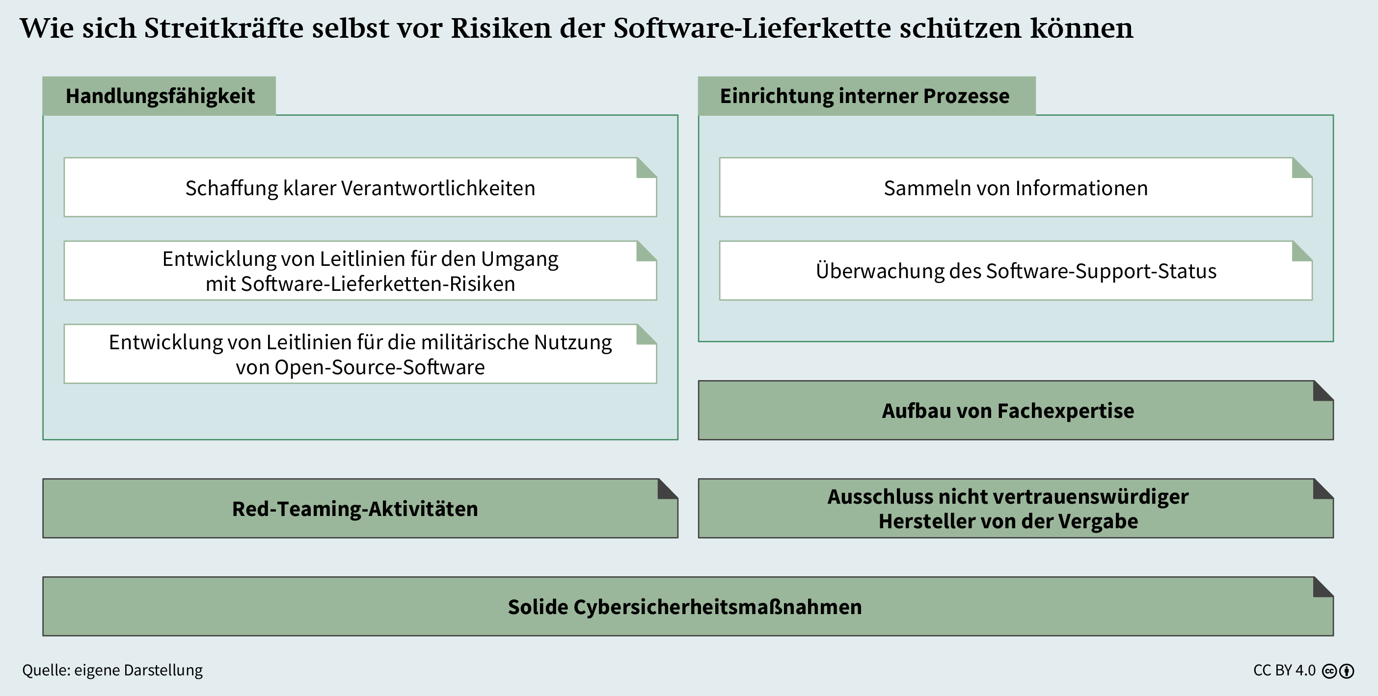 Der Bundespolitik und der Bundeswehr stehen mehrere Maßnahmen zur Verfügung, um die Streitkräfte vor den Auswirkungen der Risiken der Software-Lieferkette zu schützen. Dabei müssen Entscheidungsträger:innen zunächst für unterschiedliche Einsatzbereiche von Software ein angemessenes Schutzniveau festlegen, um die Balance zu wahren zwischen dem Schutz vor den Risiken auf der einen und Funktionalität, Kosten und Einsatzgeschwindigkeit auf der anderen Seite.