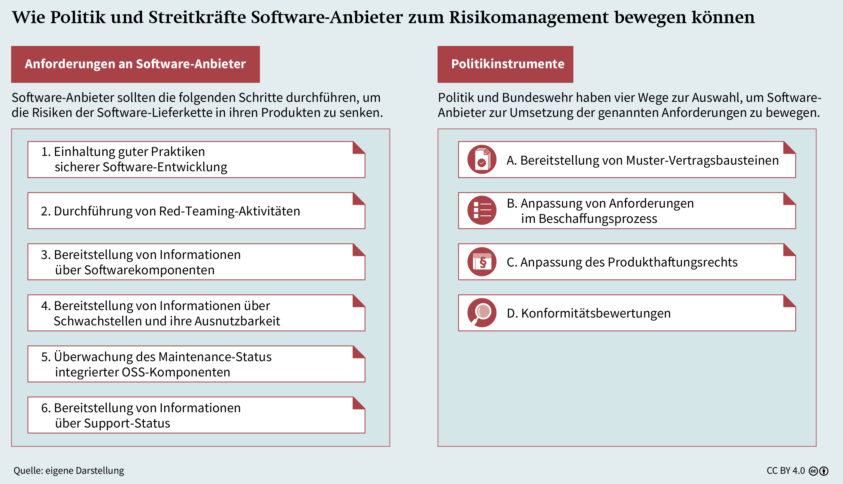 Die Bundesregierung und die Bundeswehr sollten einerseits Maßnahmen ergreifen, um einen bewussten Umgang der Streitkräfte mit den Risiken der Software-Lieferkette zu ermöglichen und sich selbst zu schützen; andererseits sollten sie Software-Anbieter dazu bringen, die Angreifbarkeit ihrer Produkte zu reduzieren. Durch die Kombination beider Ansätze kann diese mögliche Bedrohung in Schach gehalten werden.