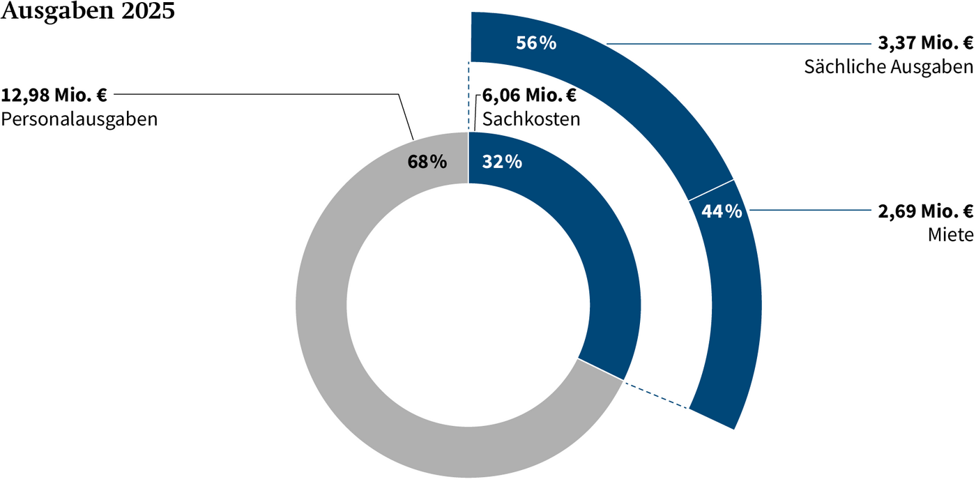 Im Haushaltsjahr 2025 wurden insgesamt € 19,04 Mio. verausgabt. Davon entfielen € 12,98 Mio. (68 %) auf Personalausgaben und € 6,06 Mio. (32 %) auf Sach- und Investitionskosten. Die Sach- und Investitionskosten setzten sich aus Mietkosten in Höhe von € 3,37 Mio. (56 %) sowie weiteren Sachkosten in Höhe von € 2,69 Mio. (44 %) zusammen.