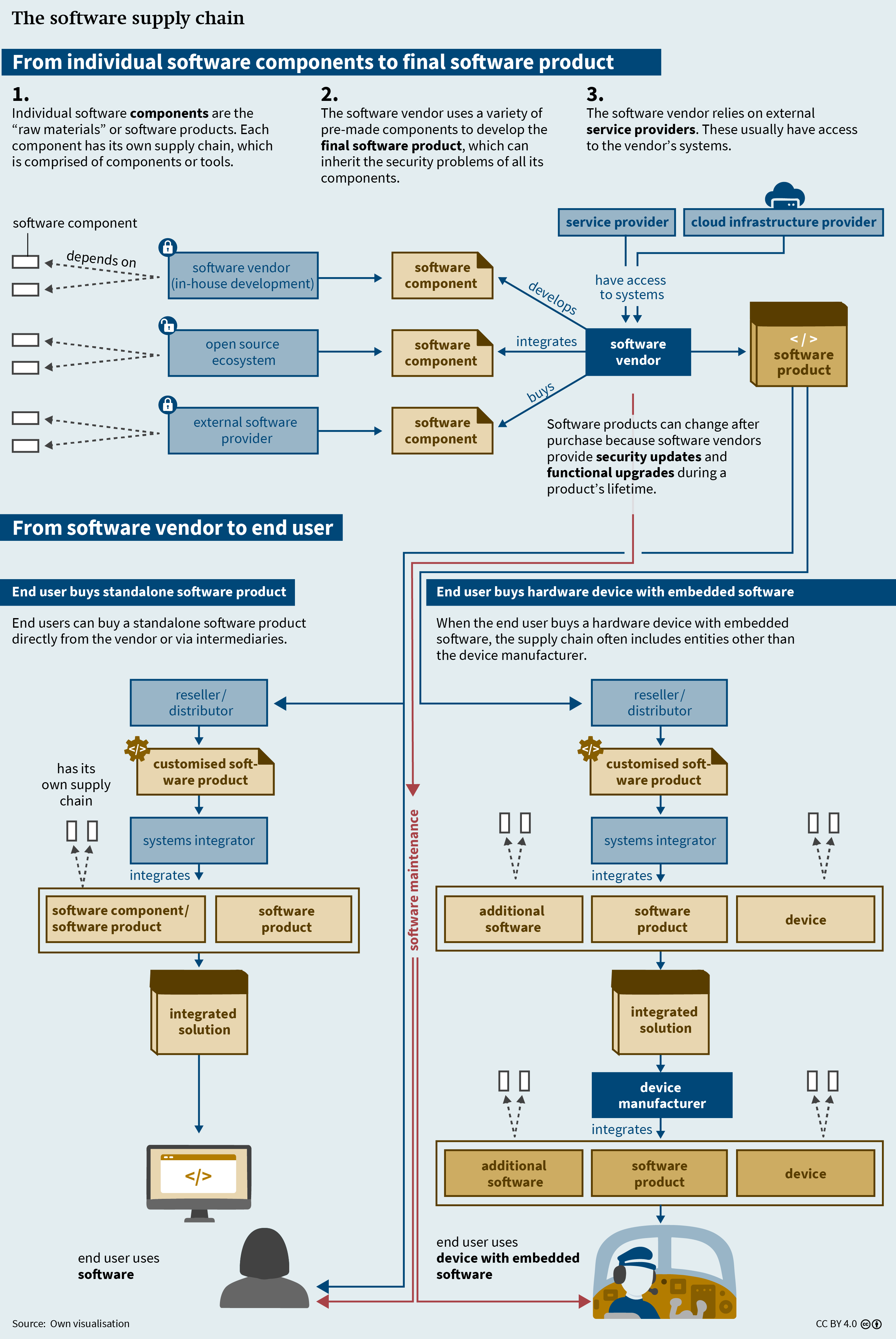 In short, it is this complex web of software components, software vendors and their suppliers, and service providers that forms the supply chain of every software product.