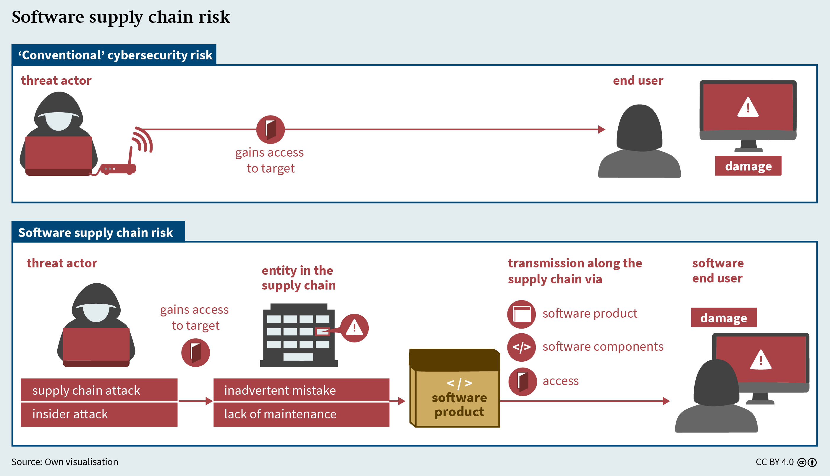 In “conventional” cybersecurity incidents, threat actors usually gain direct access to their target. But in the case of the software supply chain, the risks originate upstream in the supply chain itself and have an impact on entities downstream – often the end users.