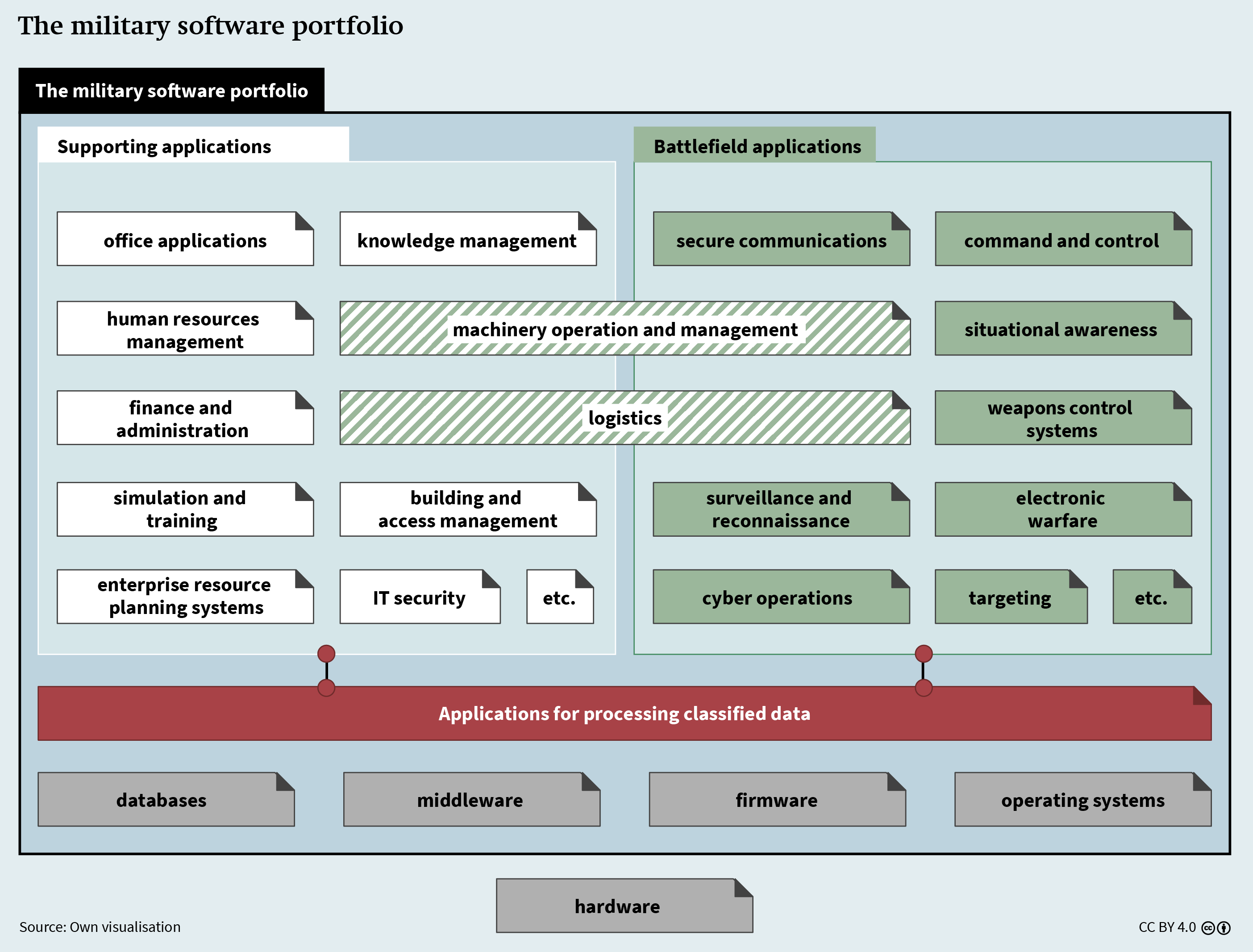 The armed forces have a broad portfolio of different software products (see Figure 3, p. 16). Like civilian organisations, they use software to support processes and process information; these supporting applications include office programmes and enterprise resource planning systems. At the same time, the armed forces need battlefield applications such as situational awareness platforms and command and control systems. Moreover, they work with classified information and the systems that process such data must meet additional security requirements. All these applications rely on a vast range of other types of software, such as operating systems and databases.