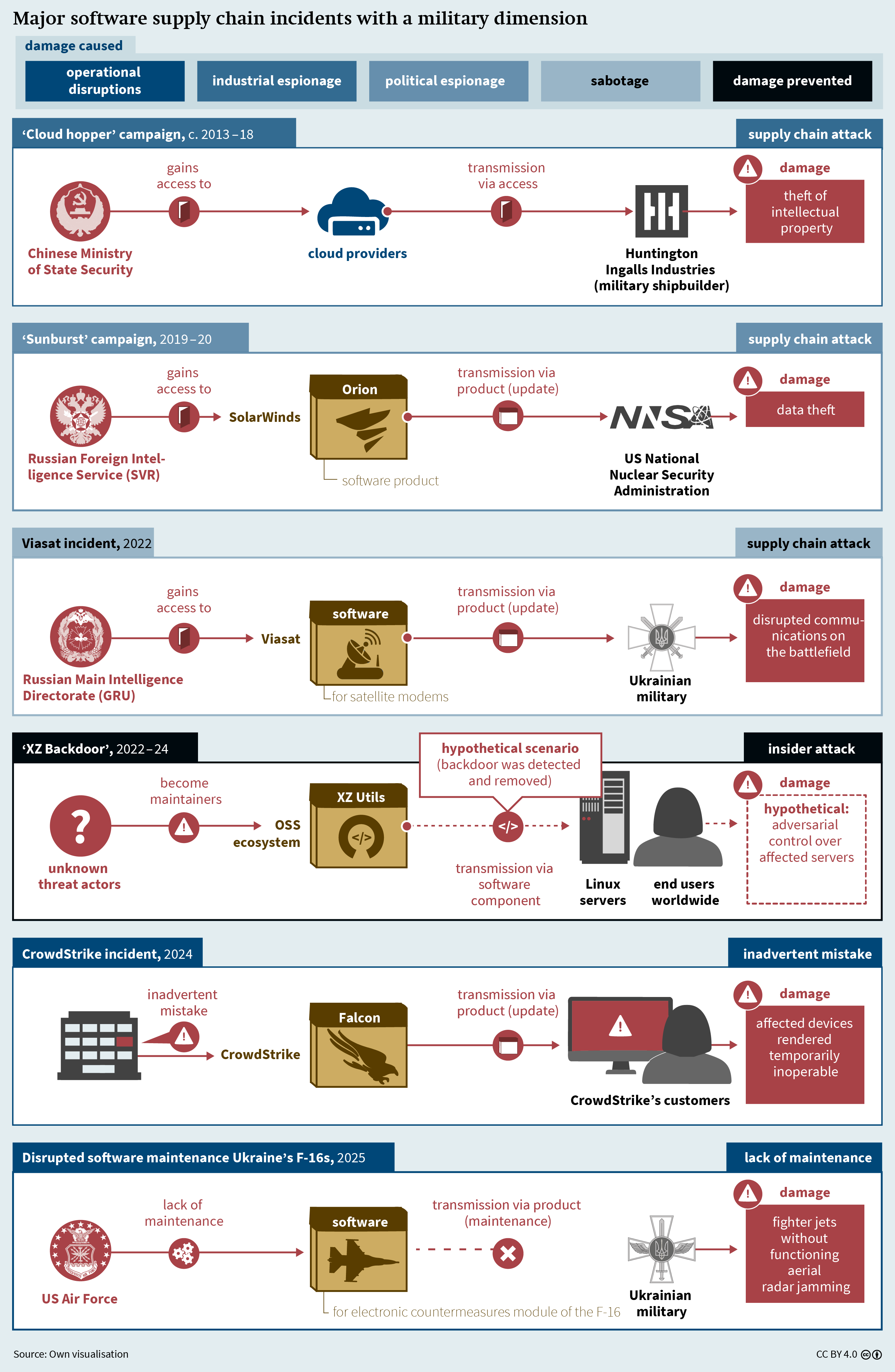 Incidents involving the software supply chain have disrupted military operations and allowed malicious actors to engage in industrial espionage, political espionage, and sabotage. For example, between 2013 and 2018, individuals associated with Chinese intelligence gained access to the systems of the largest US military shipbuilder via its cloud service provider. And in 2022, on the very first day of the Russian full-scale invasion of Ukraine, Russian military intelligence hijacked a software update from a satellite communications provider to disrupt the connectivity of the Ukrainian military on the battlefield. Even inadvertent mistakes can cause significant damage, as demonstrated by the CrowdStrike incident in 2024, which temporarily rendered approximately 8.5 million devices worldwide unusable. Finally, a lack of software maintenance can have profound consequences, too: in March 2025, Ukrainian fighter jets were at risk of becoming inoperable in the absence of software updates provided by the US. In short, software supply chain incidents can jeopardise the combat readiness of the armed forces.