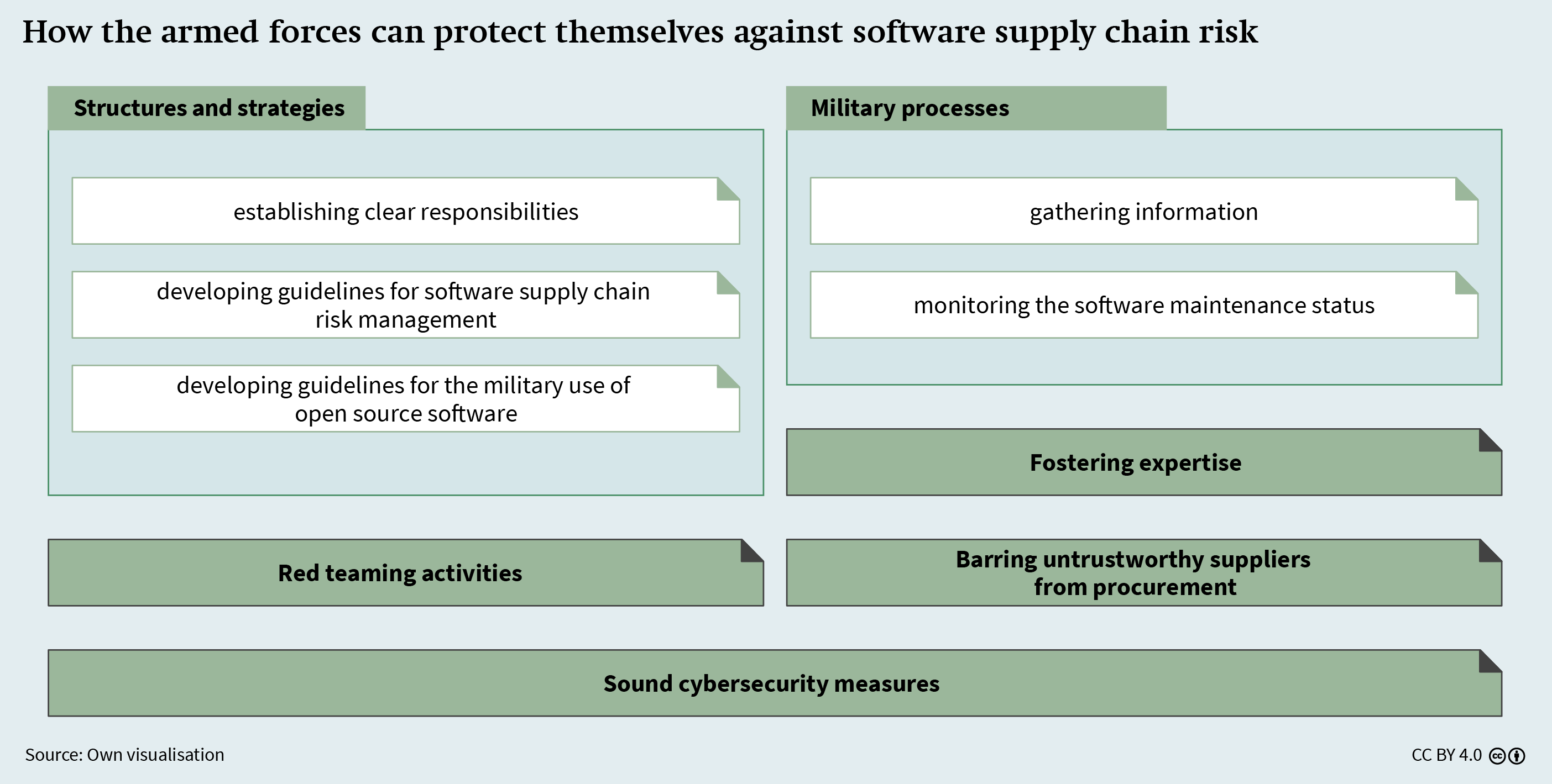 Thereafter, the Bundeswehr should establish effective risk management. Further, the federal government and the Bundeswehr should ensure that software suppliers reduce the software supply chain risk posed by their products. By doing so, the armed forces can be given adequate protection.
