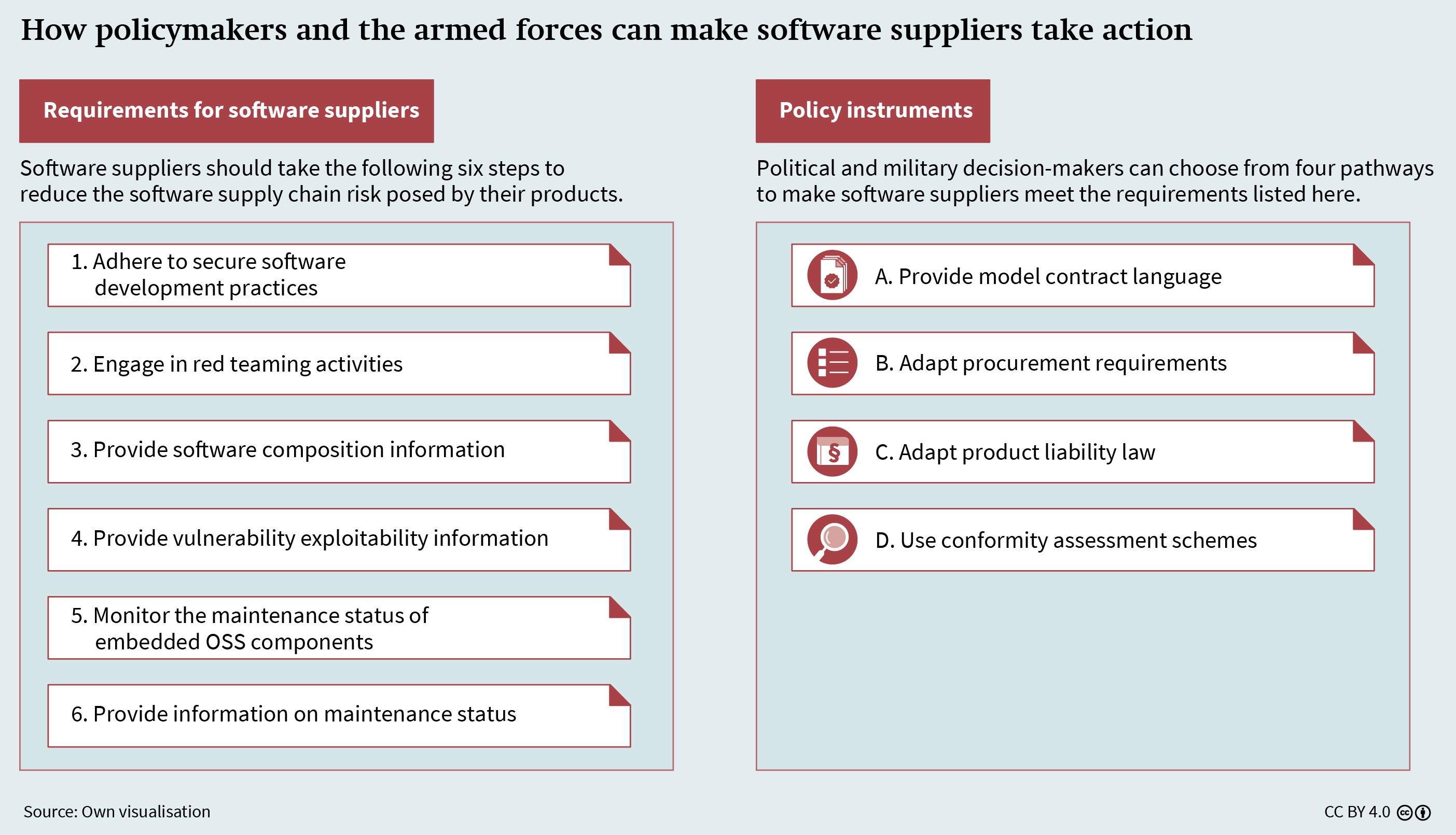 At the same time, policymakers and the Bundeswehr should make software suppliers reduce the risks associated with their products. To this end, they should: