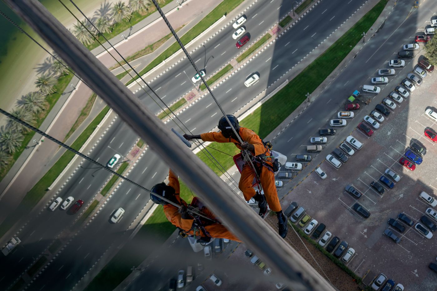 Viele afrikanische Migrant*innen, die Rücküberweisungen an ihre Familien senden, arbeiten in der Baubranche oder im Dienstleistungssektor am Golf, so wie dieser Arbeiter, der am 18. Februar 2026 in Sharjah, in der Nähe von Dubai, die Fenster eines Hochhauses reinigt.
