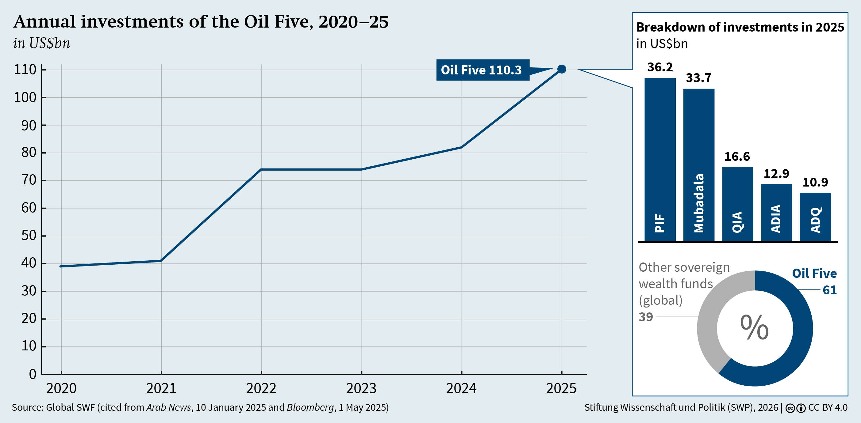 In 2024, the Saudi Public Investment Fund (PIF), the Qatar Investment Authority (QIA) and the Emirates’ Abu Dhabi Investment Authority (ADIA), Mubadala and ADQ all ranked among the world’s 10 most active sovereign wealth funds1 for the third consecutive year. Collectively referred to as the “Oil Five”, these funds accounted for around 61 per cent of the total investment volume – some US$180.3 billion – of the 100 or so sovereign wealth funds around the globe (see Figure 1, p. 8).2 The five’s combined investment volume of over US$110 billion was more than the total public investment made by the German govern­ment in 2025 (€86.8 billion).3 With combined assets of around US$3.5 trillion, they control nearly a quar­ter of the total asset value of sovereign wealth funds worldwide, which is currently just under US$15 tril­lion (see Figure 2, p. 9). However, their rise to promi­nence in international capital markets has been gradual, having begun more than two decades ago.