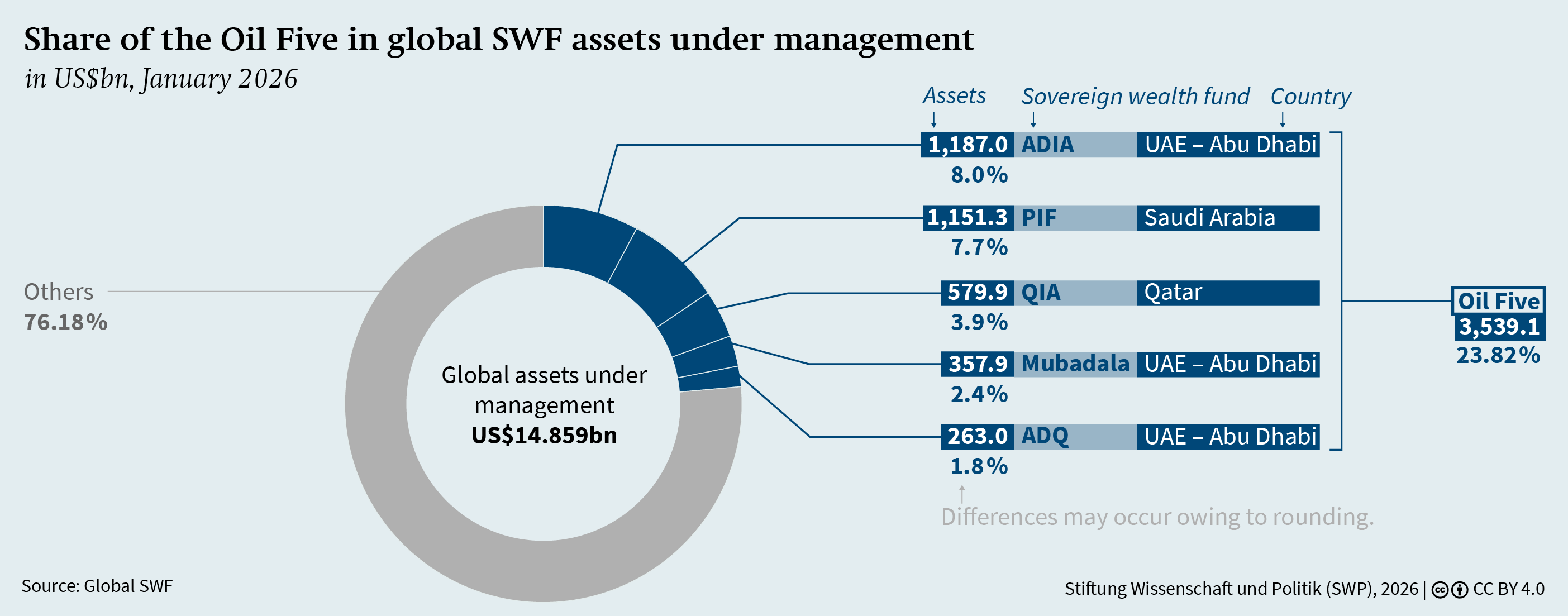 Sovereign wealth funds are playing a central role in the economic development of the three Gulf mon­archies of Saudi Arabia, the United Arab Emirates (UAE) and Qatar. They serve as key financing and governance instruments in the transition from oil- and gas-based rentier towards more diversified econo­mies. At the same time, as is increasingly emphasised by the research on sovereign wealth funds, they are not merely economic actors but can also be used to advance the foreign policy objectives of the respective states. In the three Gulf monarchies, this is evident from the personnel overlap between those managing the funds and those directing domestic and foreign policy. However, owing to the largely opaque deci­sion-making processes within the funds, it is often difficult to clearly distinguish between the economic and foreign policy motivations of certain investments. To assess the foreign policy significance of sovereign wealth funds, this study focuses on the power re­sources of the Gulf monarchies. Based on the region’s most active sovereign wealth funds – which are sometimes referred to as the “Oil Five” – it examines the extent to which their activities enable the respec­tive states to exercise hard, soft and sharp power. The five funds are the Saudi Public Investment Fund (PIF), the Qatar Investment Authority (QIA) and the Emir­ates’ Abu Dhabi Investment Authority (ADIA), Mubadala and ADQ.