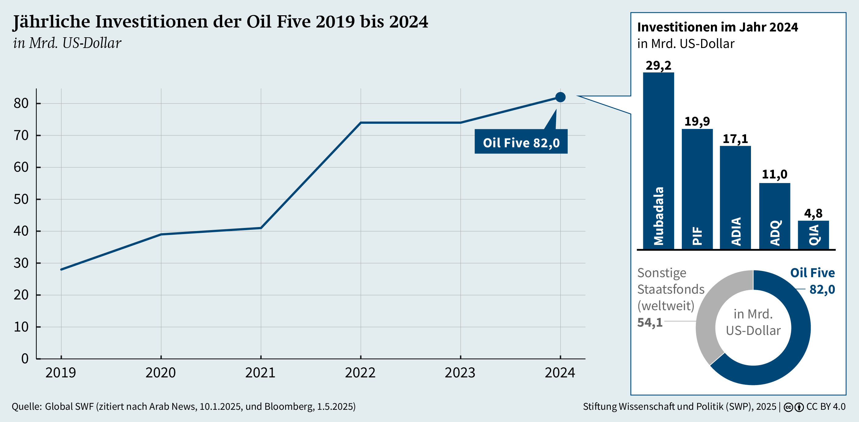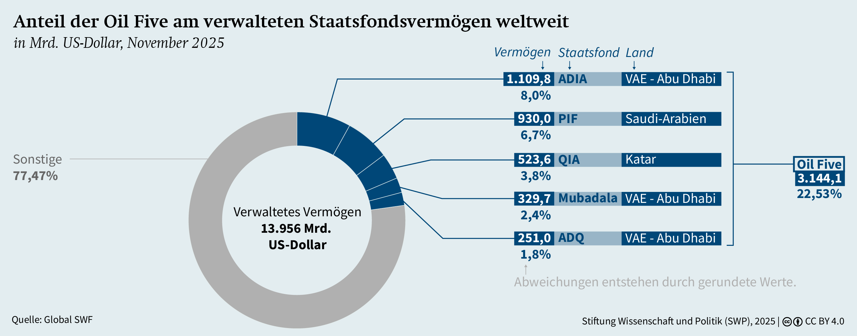 Die drei Golfmonarchien Saudi-Arabien, Katar und Vereinigte Arabische Emirate verfügen über fünf der aktivsten und größten Staatsfonds weltweit: den saudischen Public Investment Fund (PIF), die Qatar Investment Authority (QIA) sowie die drei emiratischen Fonds Abu Dhabi Investment Authority (ADIA), Mubadala und ADQ.